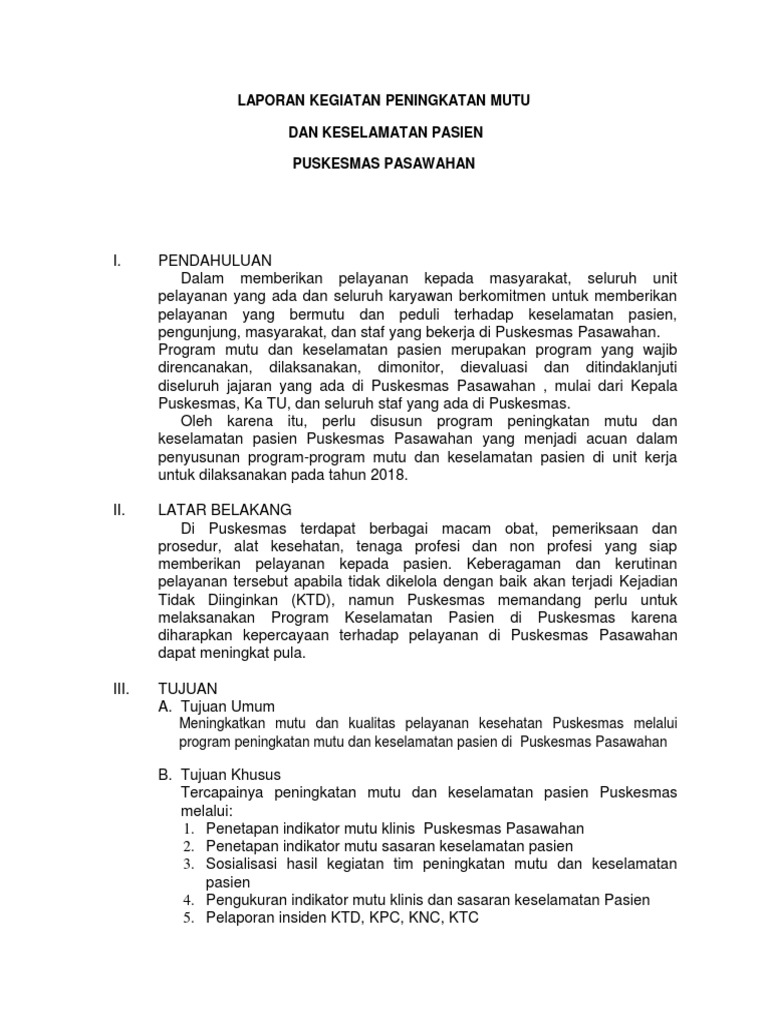 Laporan rca berisi rincian seluruh kegiatan pelaksanaan rca mulai dari awal sampai rekomendasi yang diberikan. • sosialisasi upaya keselamatan pasien ke seluruh puskesmas 3. Angka pengkajian awal medis pada pasien rawat inap selesai dalam 24 jam. Tiap pokja melaporkan kegiatan setiap bulan kepada ketua tim pmkp dalam bentuk laporan bulanan. View laporan program kerja pmkp 2019.docx from aa 1program peningkatan mutu dan keselamatan pasien di puskesmas tahai 2019 puskesmas tahai jl.
