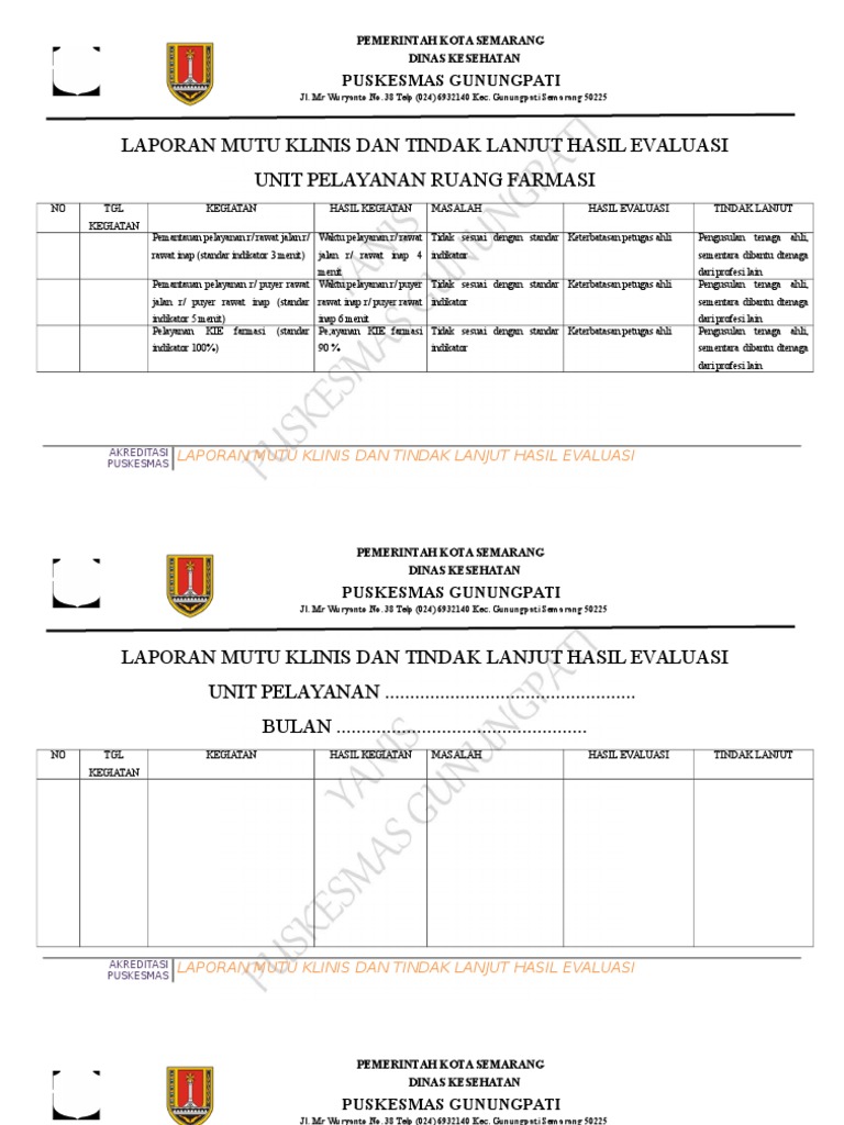 Laporan Pmkp Puskesmas - 9 4 4 Ep 3 Laporan Kegiatan Peningkatan Mutu Klinis Dan Keselamatan Pasien - Tahunan (laporan kepala unit kerja & laporan ke yayasan)sarana yang dipergunakan dalam monitoring dan evaluasi adalah :1.. Laporan kegiatan monitoring indikator mutu rumah sakit meliputi indikator mutu area klinis yang terdiri dari 10 indikator, antara lain; Dapatkan dokumen akreditasi puskesmas lengkap. Laporan langsung ke tim pmkp / direktur ( secara teratur dan insidentil ).2. • pembentukkan tim keselamatan pasien tingkat kota depok 2. Melakukan koordinasi kepada bagian / bidang / komite / unit terkait terhadap implementasi standar pelayanan yang berfokus kepada pasien dan manajemen.