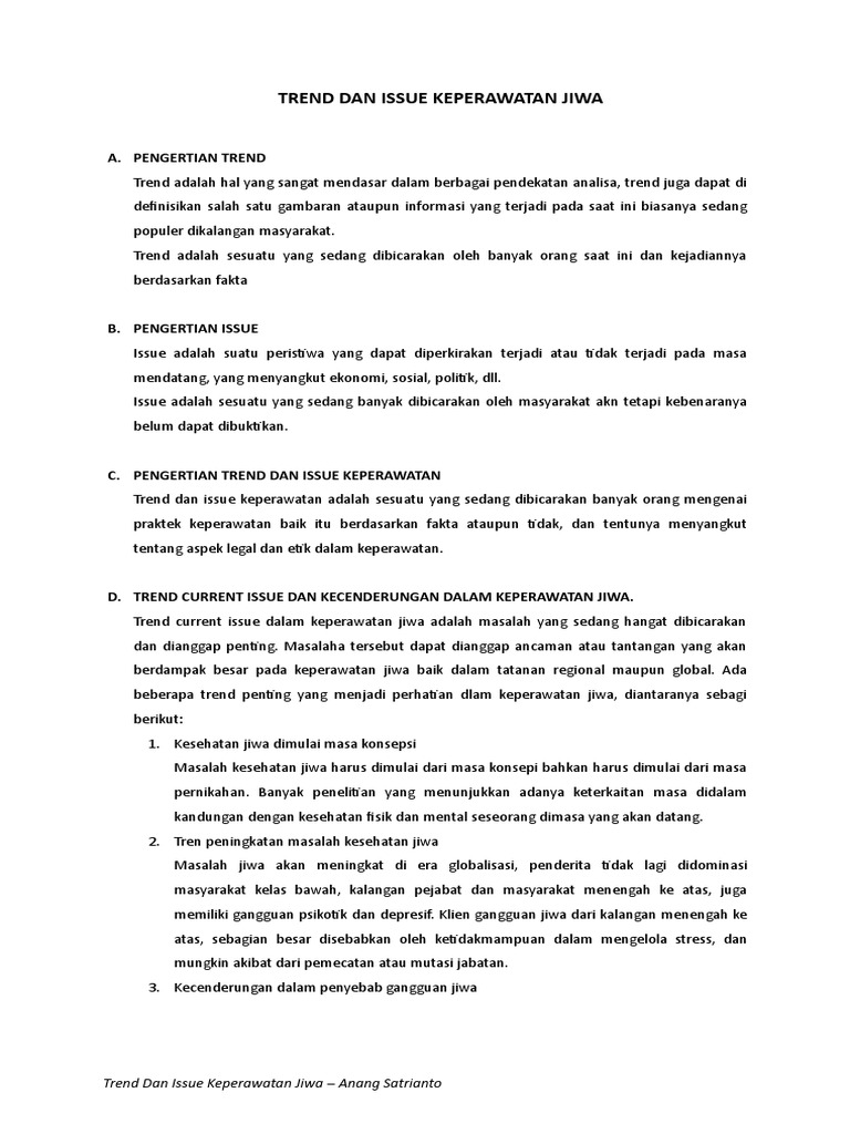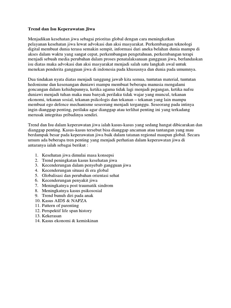 Trend Dan Isu Keperawatan Jiwa 2018 Pdf : Ruang Lingkup Dan Trend Issue Keperawatan Keluarga / Kebijakan kesehatan jiwa in patient peran petugas penting kuratif dan rehabilitatif pembiayaan masyarakat kecil tenaga apa adanya out patient peran masyarakat utama preventif dan promotif oleh masyarakat & jpkm.. Dalam acara tersebut, ade menceritakan pengalamannya melawan gangguan mental yang beliau alami, yaitu panic disorder dan menginisiasinya untuk membuat gerakan sehat mental indonesia. Kemajuan dan pertukaran iptek kemajuan teknologi transportasi migrasi mudah interaksi keluarga berubah. Pdf drive investigated dozens of problems and listed the biggest global issues facing the world today. Trend issue kegiatan asuhan keperawatan jiwa terbaru. Bab ii pembahasan trend isu keperawatan.